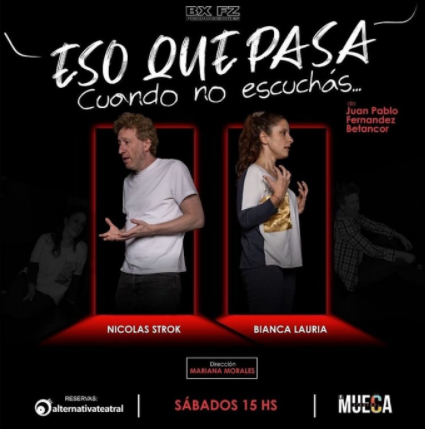 Eso que pasa cuando no escuchás podría ser algo así como Historia de un Matrimonio versión teatral argentina. Bianca Lauría y Nicolás Strok son una versión sin hijos de Scarlett Johansson y Adam Driver, a quienes la vida rutinaria pone en jaque.